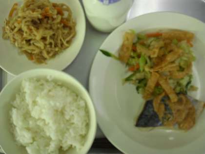 ご飯 牛乳 さわらのピリ辛ソースがけ パリパリサラダ 切り干し大根の煮付け