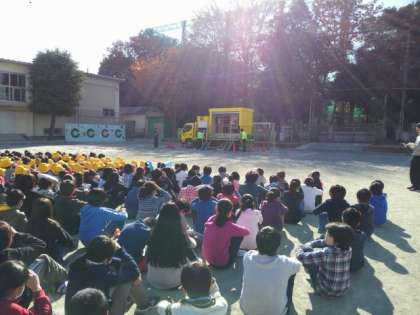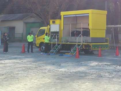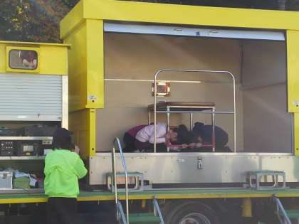 起震車で実際の揺れを体験する訓練も行いました。先生たちの代表が体験した後は6年生です。
