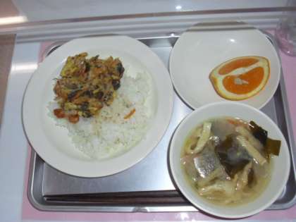 ☆今日のかき揚げには、玉葱、さつまいも、人参、春菊、ちくわ、もずくの6種類の食材が入っていました。給食のかき揚げは、鉄板にクッキングシートをしいて、1個ずつ、かき揚げの形を作り、回転釜でじっくり揚げて作ります。とても手間のかかる献立だったので、調理員さんたちは大忙しでした。