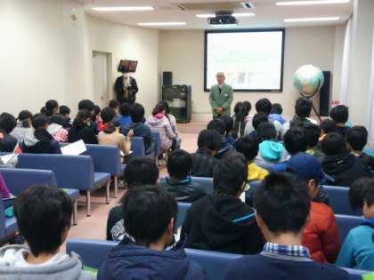 造幣局に来ています。これから造幣局のお仕事についてお話を聞き、見学をします。みんな真剣にお話を聞いています。