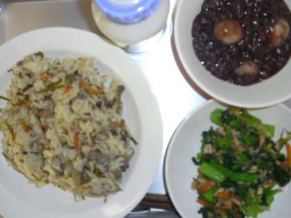 豚肉とごぼうのご飯 牛乳 ツナと野菜のおろし和え 白玉汁粉