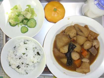 わかめご飯 牛乳 肉味噌おでん 野菜のすりごま和え みかん