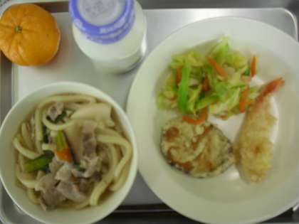 煮込みうどん 牛乳 天ぷら(えび、さつまいも) キャベツのレモン醤油和え ポンカン