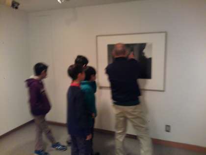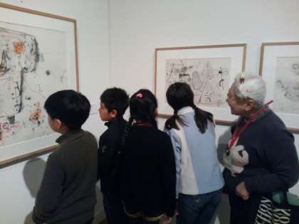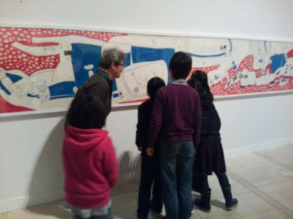 美術鑑賞リーダーさんといっしょに作品を鑑賞しています。みんな一生懸命見ています。