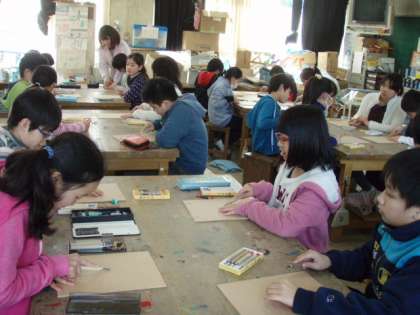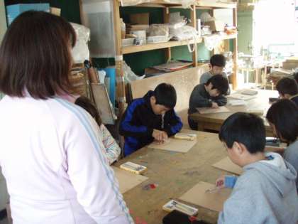 丸刀や三角刀など、それぞれの特徴を学んで、実際に彫ってみます。