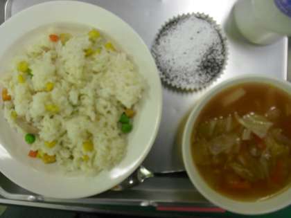 3色ピラフ 牛乳 魚介のスープ ガトーショコラ