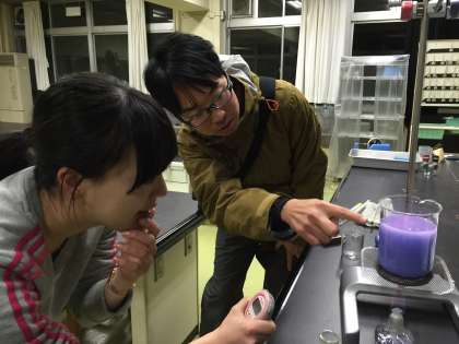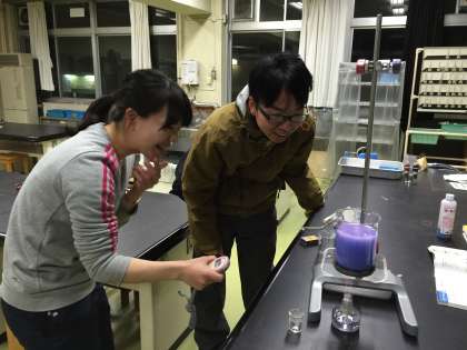 昨晩、4年生の先生が理科の事前実験をしていました。