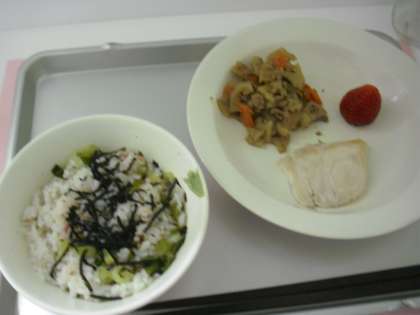 瀬田茶漬け 牛乳 目鯛の塩焼き きんぴられんこん 苺