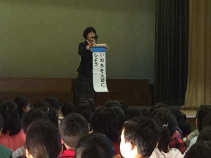 「り:理解し合える学校にしよう」では、理解というのはひとつのことを考えてよくわかること、「しあえる」というのは相手の考えをよく聞いてわかり、自分の考えを伝えられること、よく考えてお互いによくわかり合うことが大切。「いのちを大切にしよう」では、みんなの命はたくさんの命に支えられてあることについてお話がありました。