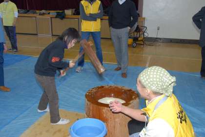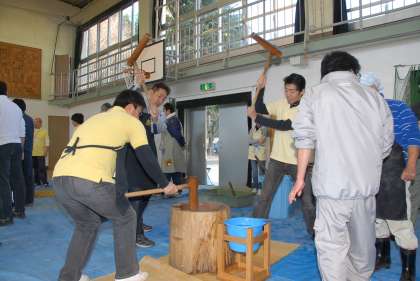 そして、PTAとおやじの会、地域の方々のご協力により、体育館での「もちつき」体験がありました。子どもたちは重い杵に体をふらつかせながらも、一人5回ずつ、臼の中の湯気の立つ餅を力一杯ついていました。お母さん方がきなこや醤油で味付けし、食べやすくしてくれた餅は、自分たちがついたということもあり、とてもおいしかったようです。