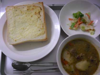 ガーリックトースト コーヒー牛乳 ハンガリアンシチュー キャベツサラダ