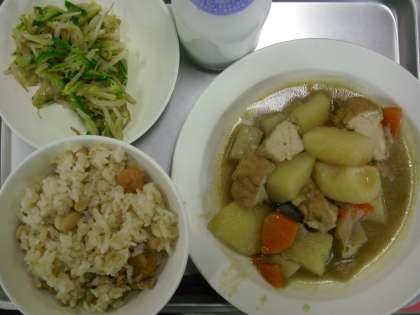大豆とえびのご飯 牛乳 五目うま煮 野菜のごま和え