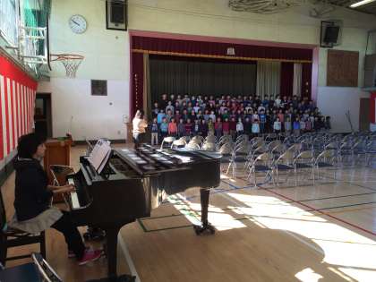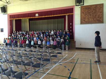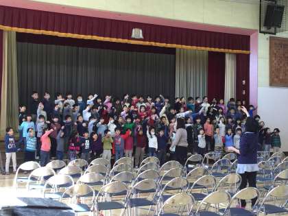 真ん中の写真は自分の歌声を紙飛行機で遠くに飛ばすイメージをもって練習しているところです。