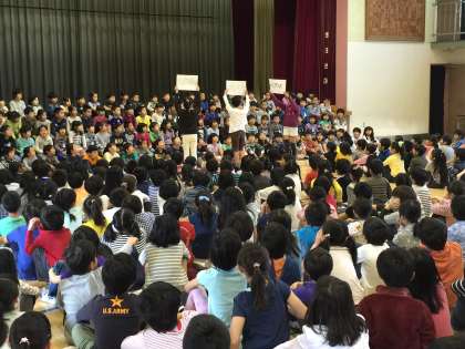 ビリーブを歌い、歓迎しました。1年生からは詩の群読のお返しです。