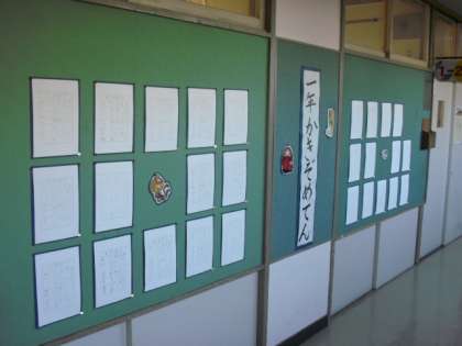 初めての書き初めが、廊下に掲示されています。