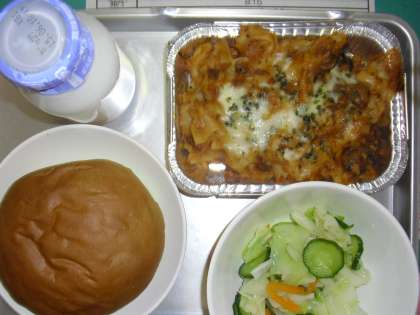 ☆今日のラザニアは、大量調理用に少し簡単なものになっています。ミートソースの中にリボンマカロニを入れたものを、グラタン皿に入れ、チーズとパセリをのせて焼きました。