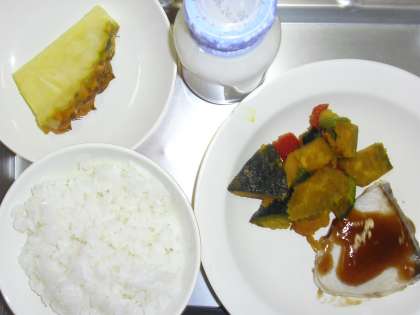 ☆今日は夏野菜の南蛮かけでした。かぼちゃ、茄子、ピーマンを素揚げにして、酸味の効いた南蛮だれをかけました。彩りがきれいでした。