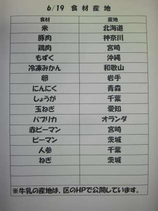 6/19(金) 給食(食材産地)