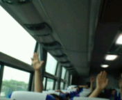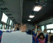 98名全員元気に、学校を出発しました。お天気が、心配ですが、バスの中は、雲を、吹き飛ばす位に、明るくレクに、夢中になっています。