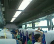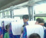 帰りは、バスレクで、盛り上がります。3号車は、真剣に、紙テープリレーです。