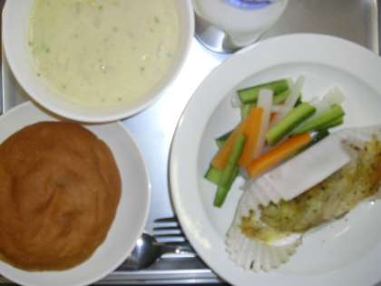米粉パン 牛乳 白身魚のガーリック焼き ピクルス コーンスープ