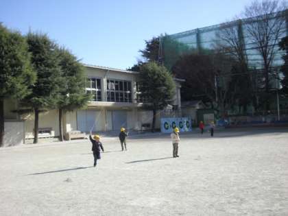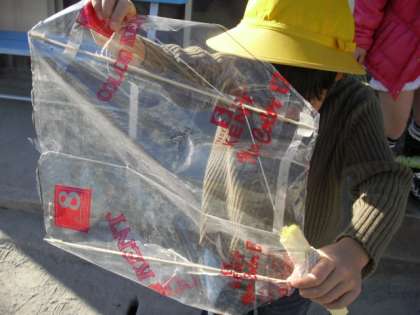 切るのがちょっと難しいビニールを頑張って切り、今度は本格的に竹ひごも使って作りました。前よりも大きく立派になった分、あげたときにもよーく上がった凧に、大きな歓声が上がっていました。