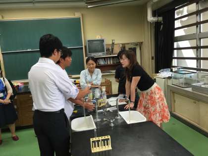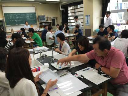 理科の研修です。思考力や表現力を高めるための工夫について、実験をしながら学びました。講師は中学校の理科の先生です。