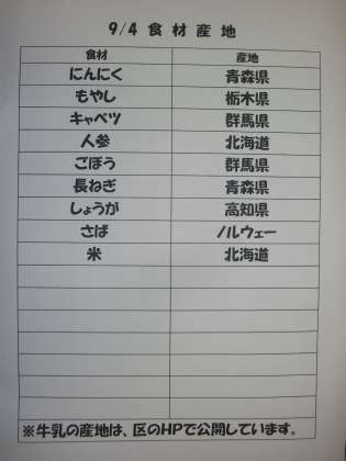9/4(金) 給食(食材産地)