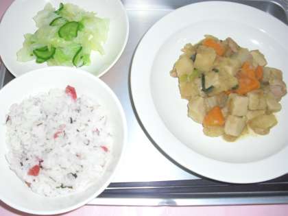 ☆今日のご飯は、炊き込みわかめと刻みしそ梅が入ったご飯でした。赤しその色が鮮やかできれいでした。
