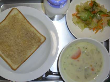 セサミトースト 牛乳 クリームスープ 野菜のイタリアンドレッシングかけ