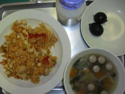 オムライス風ご飯 牛乳 ウィンナーと野菜のスープ 巨峰