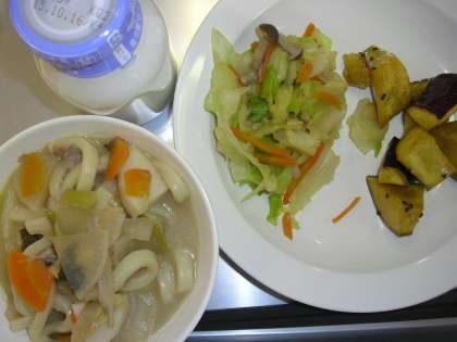 味噌煮込みうどん 牛乳 大学芋 キャベツのレモンじょうゆ和え