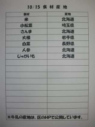 10/15(木) 給食(食材産地)