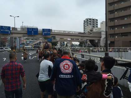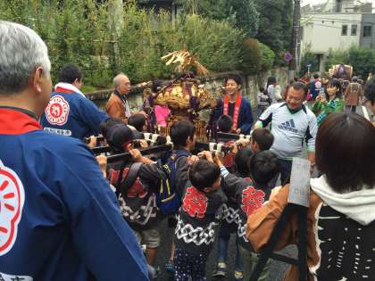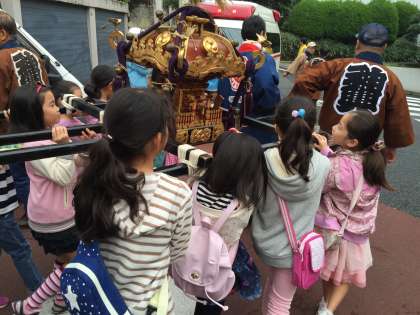 子ども神輿や山車が出ています。瀬田小の子どもたちもたくさん参加しています。