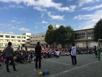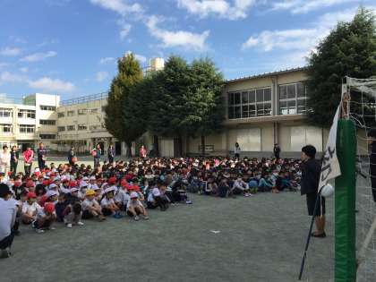 地震を想定した訓練です。校庭、教室、体育館、それぞれの場所で子どもたちは安全に気をつけ避難します。