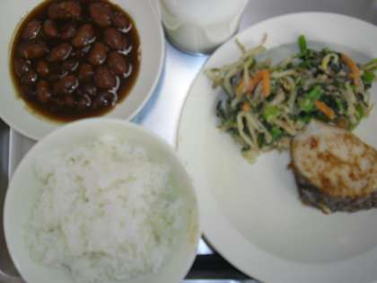 ご飯 牛乳 さわらのピリ辛ソースがけ 黒糖風味の煮豆 野菜のごまみそ和え