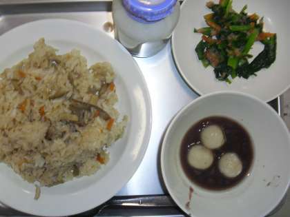 ☆今日は1日遅れの鏡開き給食で、白玉汁粉でした。朝から小豆をじっくり煮て作りました。また、今日の和えものには、春の七草のうちの2つ、すずしろ(大根)とせりを入れました。