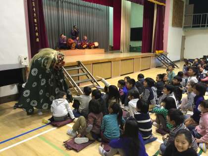 5時間目、全校児童で瀬田囃子を鑑賞しました。