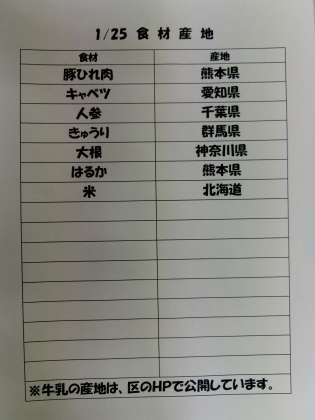1/25(月) 給食(食材産地)