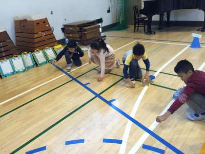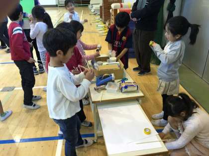 自分でつくったおもちゃを使って体育館で遊び、より楽しくするために様々な工夫をしました。気付いたことを伝え合ってお互いに工夫する様子が見られました。
