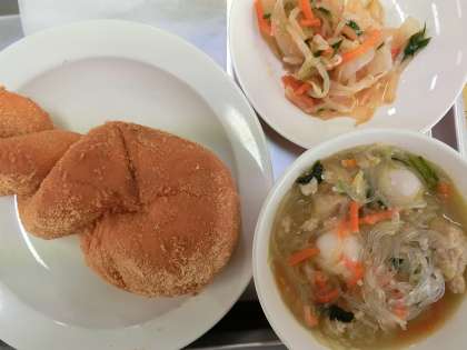 きなこ揚げパン 牛乳 肉団子入り春雨スープ こんにゃくサラダ