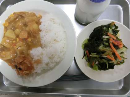 北海カレーライス 牛乳 福神漬け 海藻サラダ