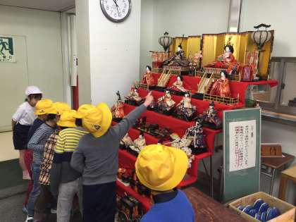 主事さんたちが玄関にひな人形を飾りました。