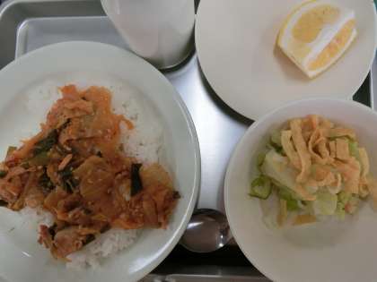 ☆今日の豚キムチ丼は、キムチが今まで使用していたものが入手できなくなったため、新しいものに変わりました。低学年の子には少し辛いキムチだったので、次回はりんごのすりおろし等を入れて、甘みを加えたいと思います。