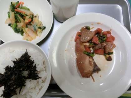 ご飯 牛乳 ひじきと梅のふりかけ ぶり大根 野菜のからしじょうゆ和え