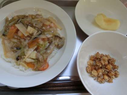 中華丼 牛乳 大豆とじゃこの甘辛揚げ りんご
