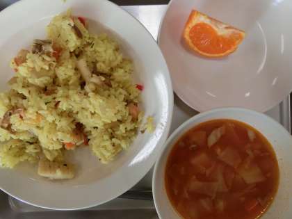 海の幸のパエリア 牛乳 ミネストローネ カラーマンダリン