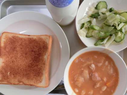 シナモントースト 牛乳 ビーンズシチュー アスパラガスのサラダ