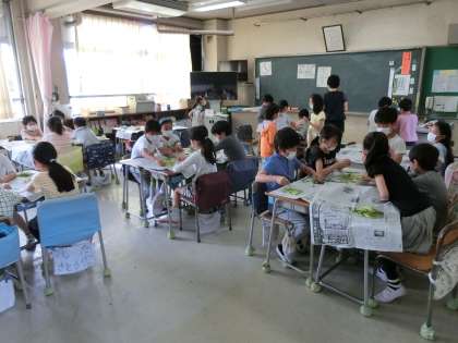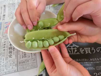 ☆今日は2年生が、グリンピースのさやとりをしました。さやをとったグリンピースは、もち米入りのご飯と混ぜました。味付けは塩だけでしたが、グリンピースの香りがして、とても美味しかったです。