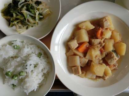 グリンピースご飯 牛乳 新じゃがいものそぼろ煮 わかポン和え